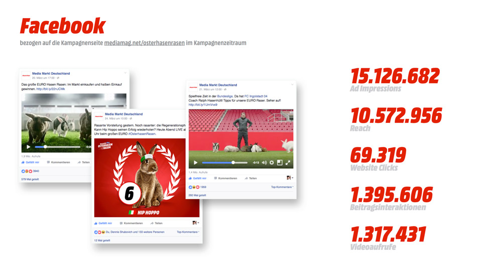 Nachdem Media Markt Deutschland zu Ostern 2015 mit dem großen Osterhasen-Rasen für Furore gesorgt hat, legten wir gemeinsam zum diesjährigen Osterfest noch eins drauf und weiteten die Marketingaktion auf insgesamt drei Länder aus: In der ersten Osterwoche 2016 wird das Euro Osterhasen-Rasen in Deutschland, Österreich und Schweiz live und zeitgleich zur Prime Time von 15 TV-Sendern – RTL, SUPER RTL, RTL NITRO, RTL2, VOX, n-tv, SAT.1, ProSieben, Puls4, kabel eins, sixx, ORF 1, La télé, Léman Bleu und Tele Ticino – sowie im Internet, u.a. auf mediamag.net und YouTube, übertragen.